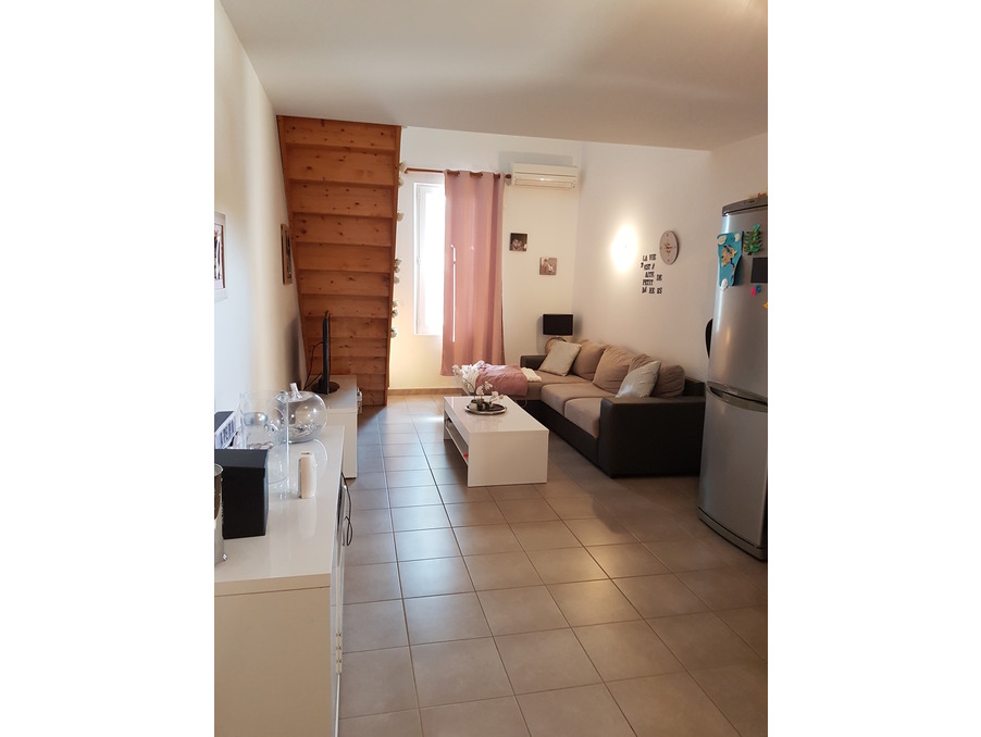 Hall d'entrée au rez-de-chaussée. A l'étage : séjour/cuisine aménagée et équipée (hotte aspirante, four et plaque de cuisson), 2 chambres dont 1 en mezzanine, salle de bains, wc. Climatisation réversible, chauffage électrique, double vitrage. Cave.