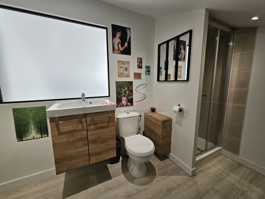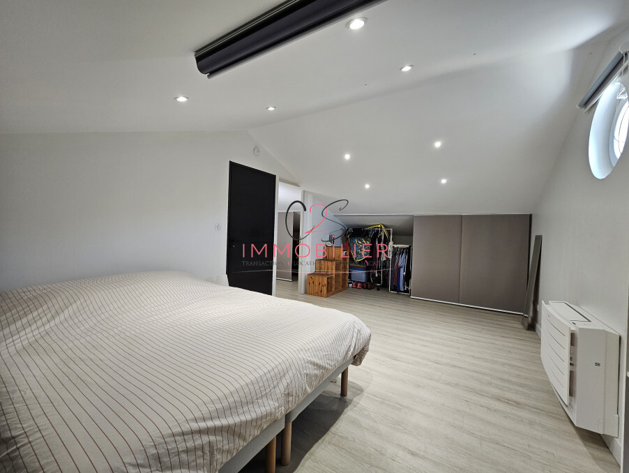 A l'étage, se trouve une spacieuse suite parentale climatisée de 36m2 environ au sol, avec salle d'eau/WC et nombreux rangements.