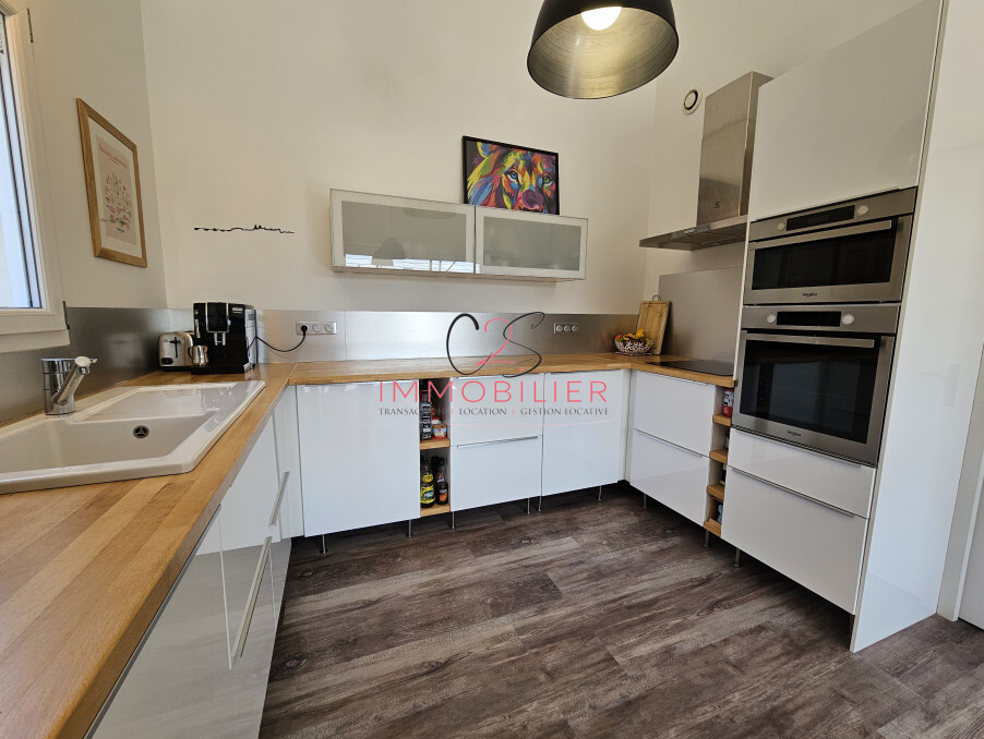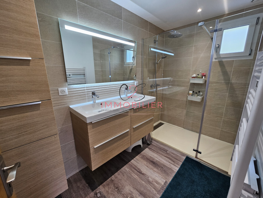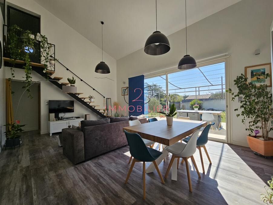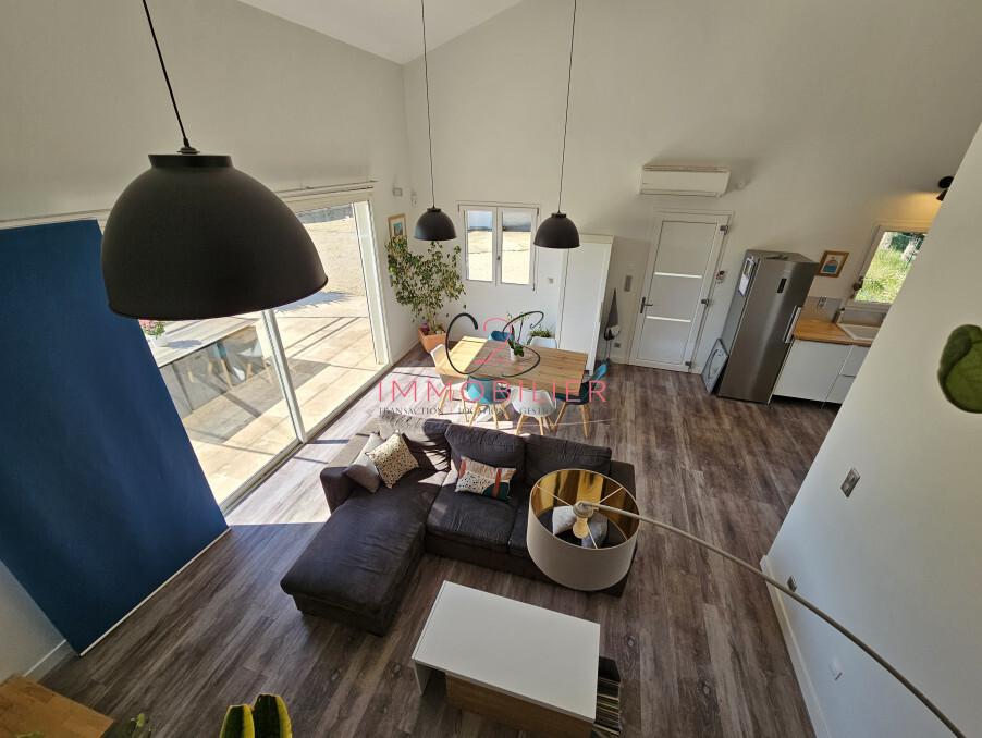 Maison récente (2018) de 113m2 au sol composée en RdC d'un vaste séjour cathédrale lumineux avec cuisine ouverte offrant un espace de vie de 41m2 environ et une large baie vitrée exposée Sud donnant sur le jardin, 2 belles chambres de 11 m2 environ, WC, salle d'eau et buanderie.