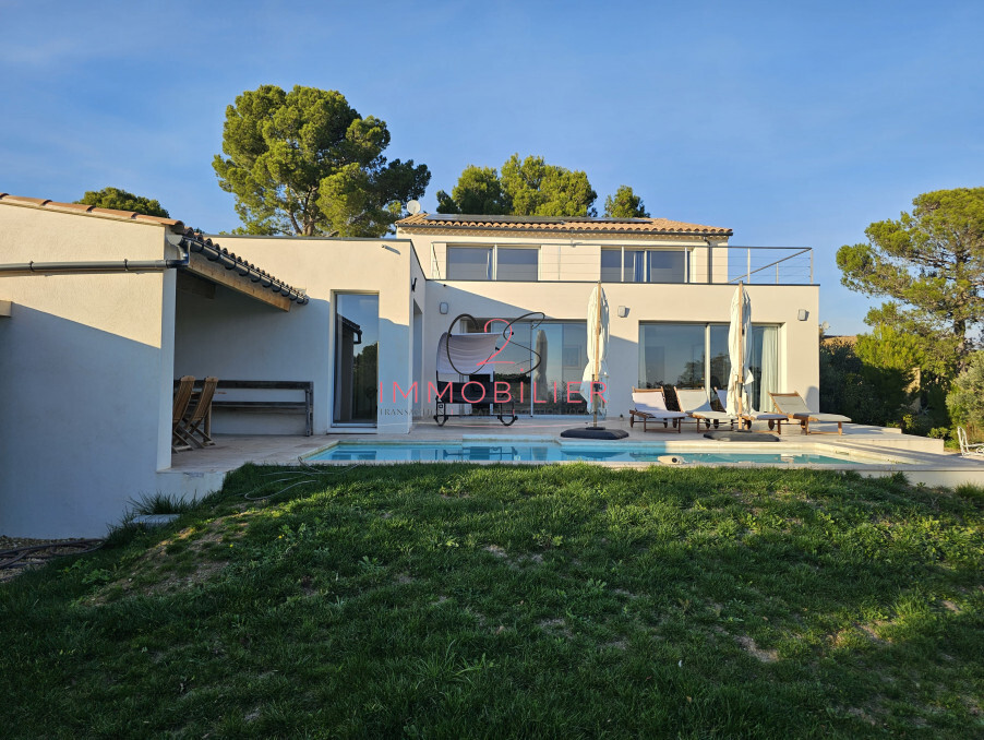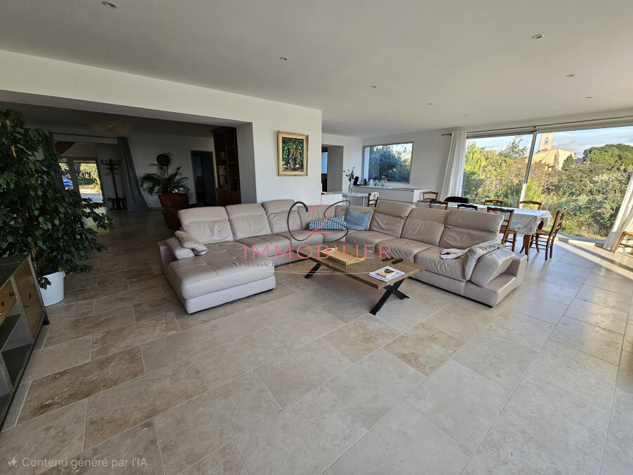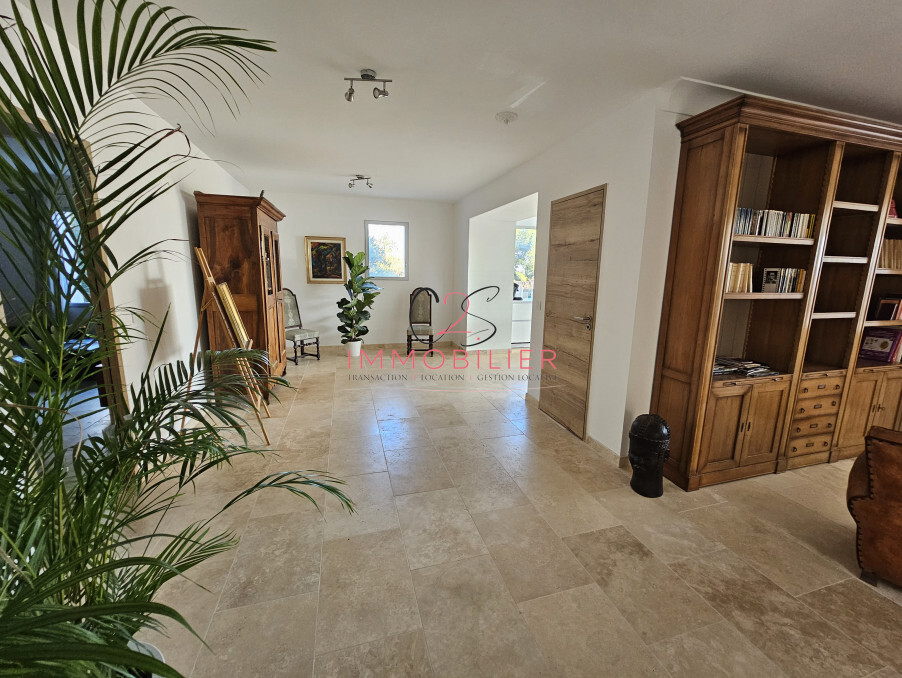 À proximité immédiate du centre-ville, cette maison contemporaine entièrement rénovée développe environ 304 m² habitables, sur un terrain arboré de 1 738 m², traversé par une élégante allée d’oliviers. L’ensemble offre une configuration rare, un niveau de confort élevé et un emplacement remarquable.La pièce de vie de 104 m², baignée de lumière, s’ouvre sur l’extérieur par de vastes baies vitrées, renforçant la continuité entre intérieur et jardin. Chaque espace a été pensé pour offrir volume, clarté et fluidité.