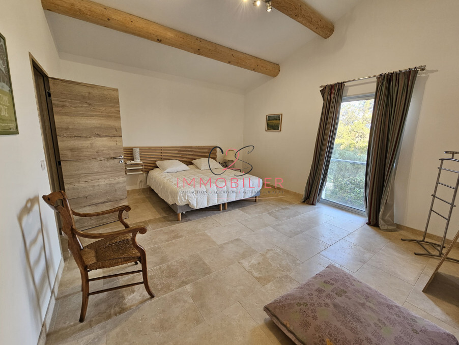 La maison dispose de cinq suites indépendantes, chacune équipée de salle d’eau et WC privatifs. Deux suites bénéficient d’un accès direct à une terrasse dominante avec vue panoramique sur la plaine, les Alpilles et le Luberon, tandis qu’une autre s’ouvre directement sur l’espace piscine. L’ensemble assure une circulation fluide, idéale pour une résidence familiale ou un lieu d’accueil haut de gamme.