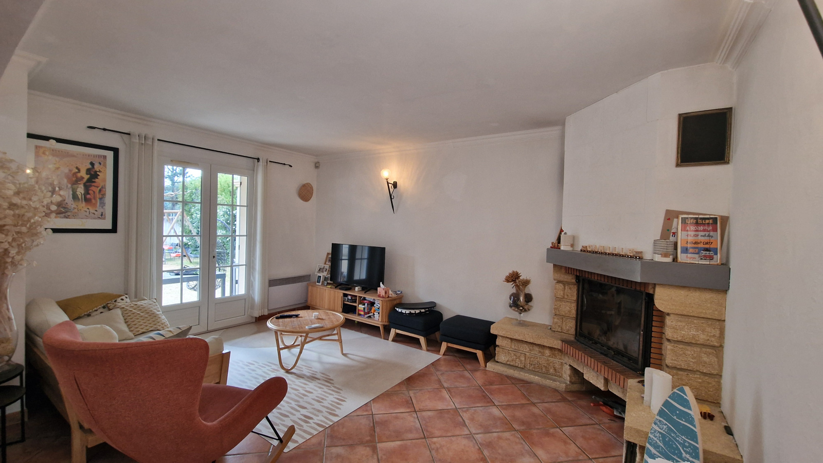 Au calme, villa comprenant au rez-de-chaussée : séjour avec cheminée insert et climatisation réversible, cuisine indépendante aménagée et équipée, grand cellier, 1 chambre avec placard, salle d'eau, wc.