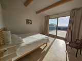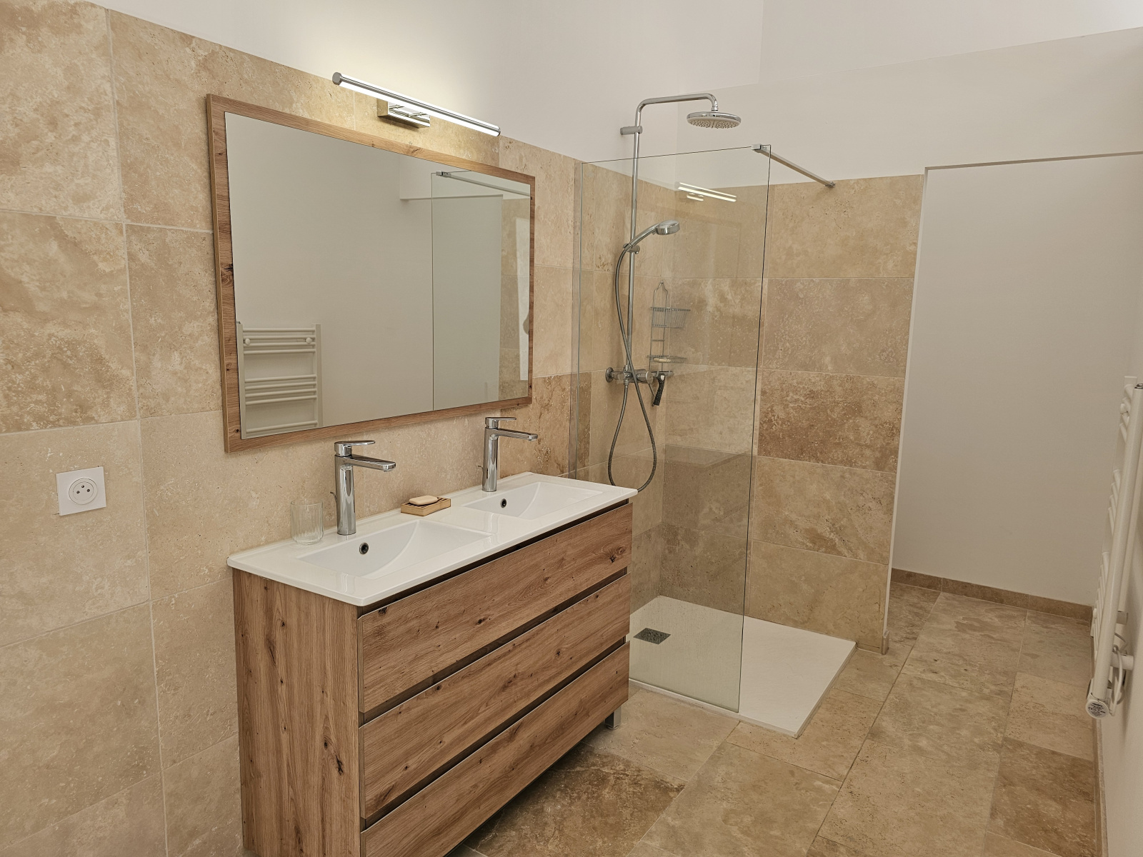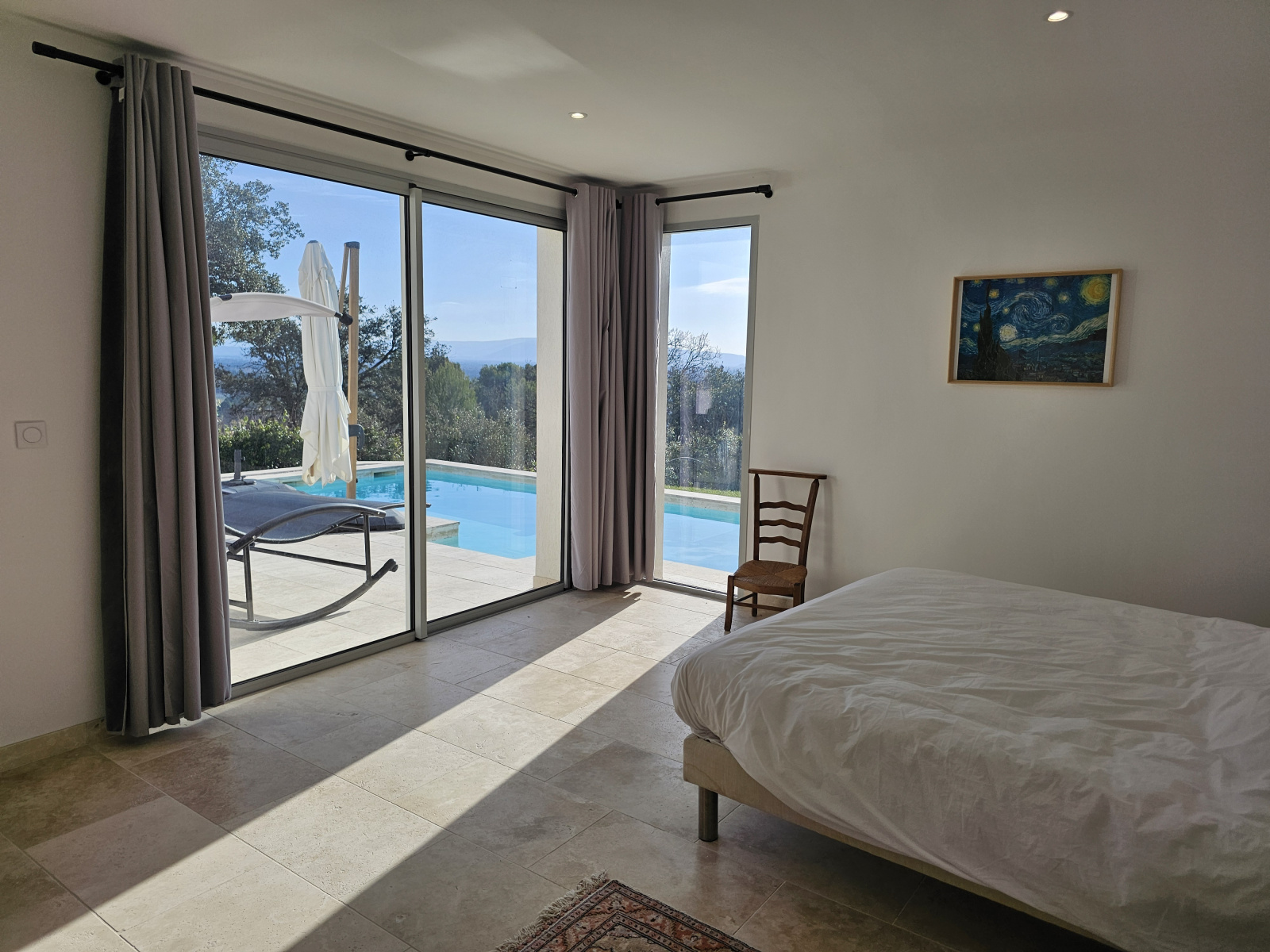 La maison dispose de cinq suites indépendantes, chacune équipée de salle d’eau et WC privatifs. Deux suites bénéficient d’un accès direct à une terrasse dominante avec vue panoramique sur la plaine, les Alpilles et le Luberon, tandis qu’une autre s’ouvre directement sur l’espace piscine.
